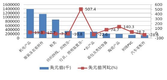 出口主要商品中,以機(jī)電產(chǎn)品、服裝、鞋類和燈具等傳統(tǒng)出口優(yōu)勢產(chǎn)品結(jié)束了2015年的下滑趨勢,均出現(xiàn)不同程度回暖。按貿(mào)易額機(jī)電產(chǎn)品、鞋類、服裝、農(nóng)產(chǎn)品和紡織制品占據(jù)前5位,降幅最大的3種商品是服裝、箱包和PVC材料,出口量分別下降48.9%、52.0%和24.1%,出口額分別下降48%、46.5%和40.8%,體現(xiàn)為量價齊跌態(tài)勢。以高新技術(shù)產(chǎn)品、汽車零件等為代表的高附加值產(chǎn)品出口在持續(xù)多年的連續(xù)增長后,自2015年起開始出現(xiàn)下滑(見圖6)。
