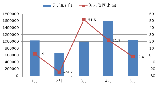 出口方面,在國際經(jīng)濟(jì)復(fù)蘇緩慢,國內(nèi)經(jīng)濟(jì)增速下降及我區(qū)主要貿(mào)易伙伴國經(jīng)濟(jì)不景氣和貨幣貶值的不利背景下,自治區(qū)外貿(mào)出口取得開門紅。前5月,自治區(qū)出口總額53.2億美元,同比增長8.2%,較去年同期增速加快29.7個百分點,比一季度增幅縮小2個百分點,增幅高于全國平均-2.9%的水平。出口增速呈現(xiàn)出較大波動,但總體呈增長趨勢。(見圖3)。