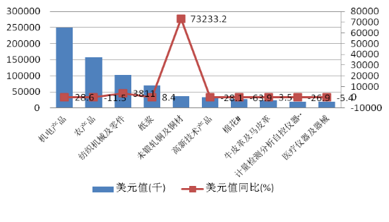 對外承包工程出口一直是自治區(qū)外貿(mào)的短板,但今年出現(xiàn)一些亮點。1-5月,我區(qū)對外承包工程貨物出口2.4億美元,同比增長56.9%。海關(guān)特殊監(jiān)管區(qū)域物流貨物7071萬美元,同比增長107.2%,也是自治區(qū)外貿(mào)表現(xiàn)不多的亮點之一。表明國家和自治區(qū)出臺的有關(guān)加大“走出去”力度,促貿(mào)易方式結(jié)構(gòu)優(yōu)化政策開始發(fā)揮作用(見表2)。